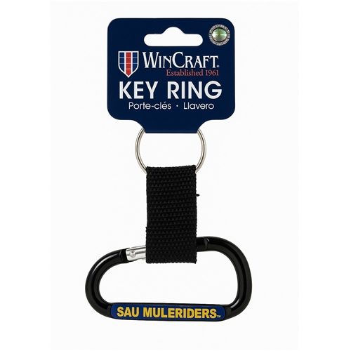 Keep your keys secure and show your Mulerider pride with this durable carabiner key ring. Featuring a sturdy black strap, metal key ring, and “SAU Muleriders” printed in gold with a blue background on a sleek black carabiner, it’s perfect for backpacks, belt loops, or keychains.