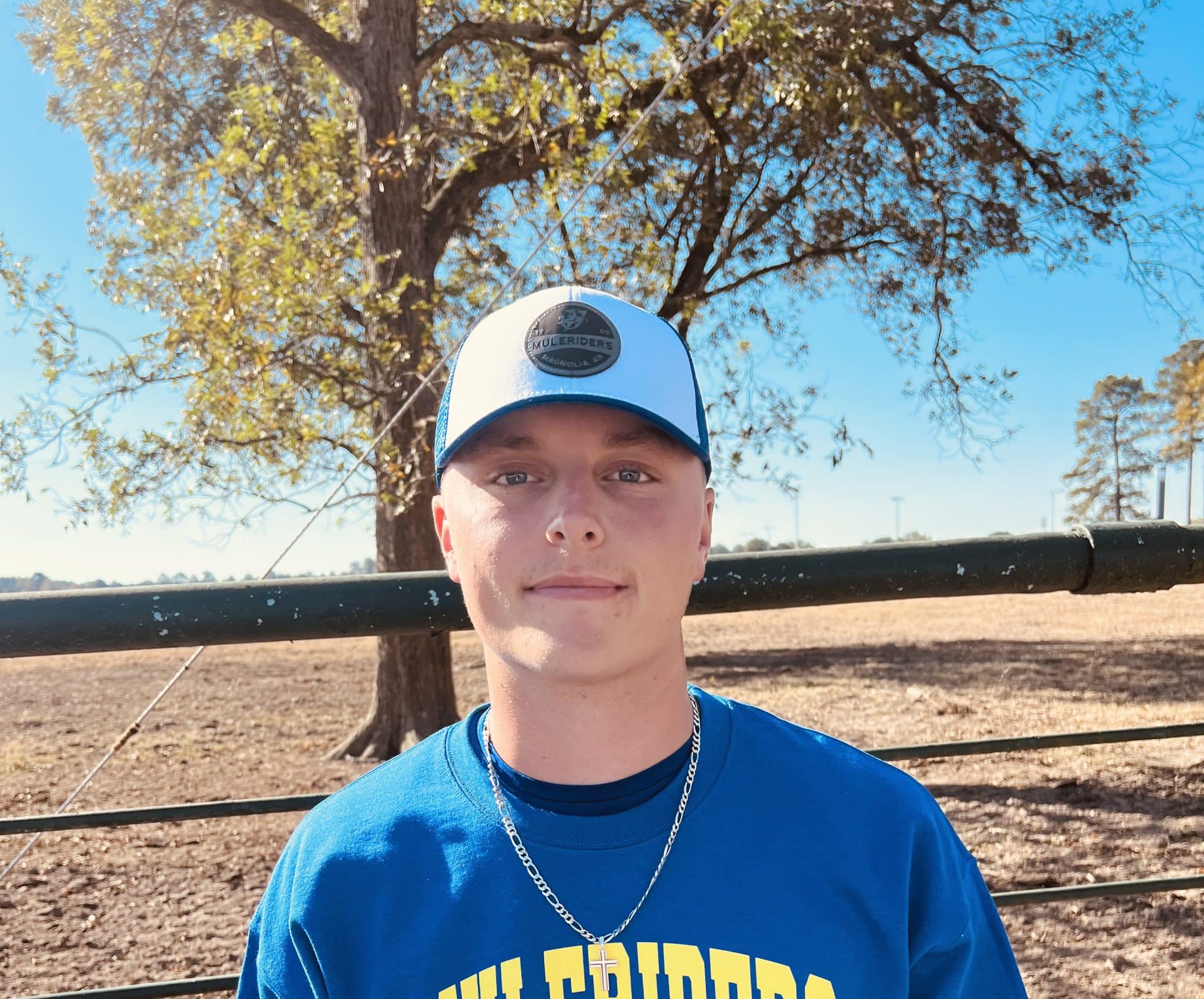 Detail: Sewed-on leather-like patch with the Mulerider logo and Magnolia, AR