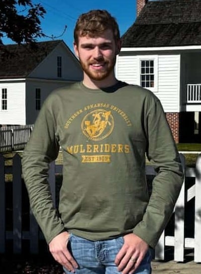 A vintage Mulerider design honors the legacy that inspired the collection, blending university pride with understated Southern character. Its name, Pine Standard, pays tribute to the towering pines that shape the Arkansas landscape — strong, steady, and unmistakably home.