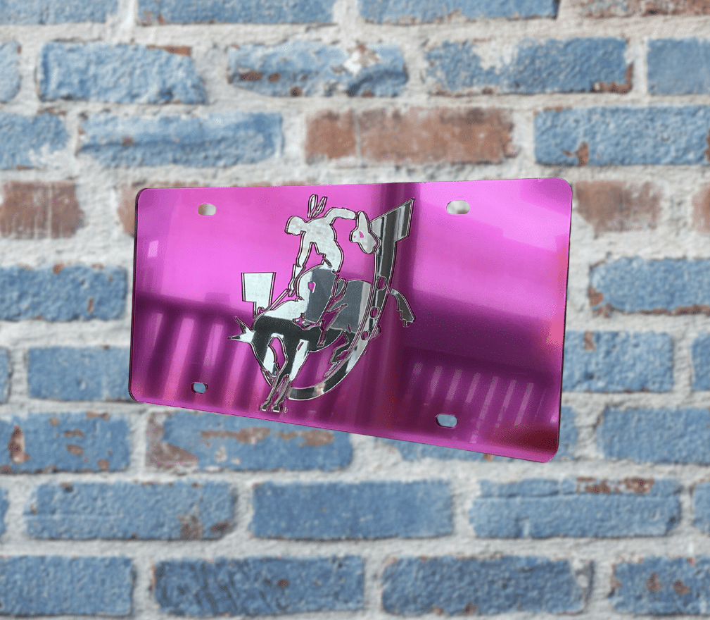 Make a bold statement with this vibrant pink mirror-finish license plate, featuring the Mulerider mascot and horseshoe logo in striking silver chrome. This unique and reflective plate is the perfect accessory for the front of your car to show your SAU spirit with flair.