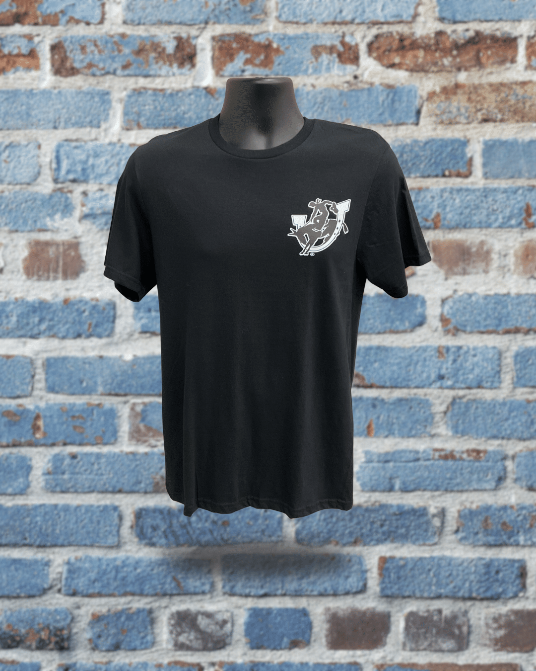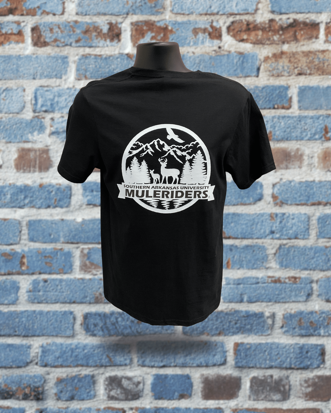 Color: Black with white screen-printed graphics of the SAU Muleriders logo on the chest and a deer/mountain scene on the back