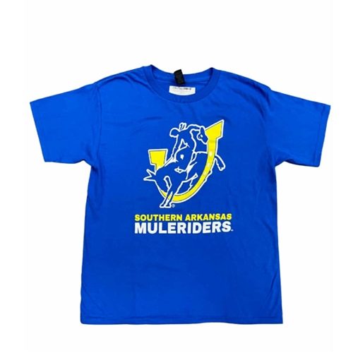 Youth Gildan Southern Arkansas University Muleriders t-shirt featuring the bold yellow and white logo on royal blue. Made from soft, durable cotton for everyday comfort and school pride.